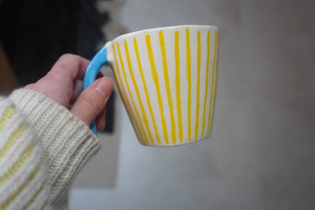 イエロー×水色の 変わった取手のマグです 口径 8.6×9.3cm 高さ 8.5cm 容量 約350ml 重さ 222g ※おおよそです 手で1つ1つ形を作り 色を塗っていますので 歪みや揺らぎが特徴です 水漏れ防止剤で処理をしておりますが 気になる場合はご自宅で目止め処理を していただければと思います